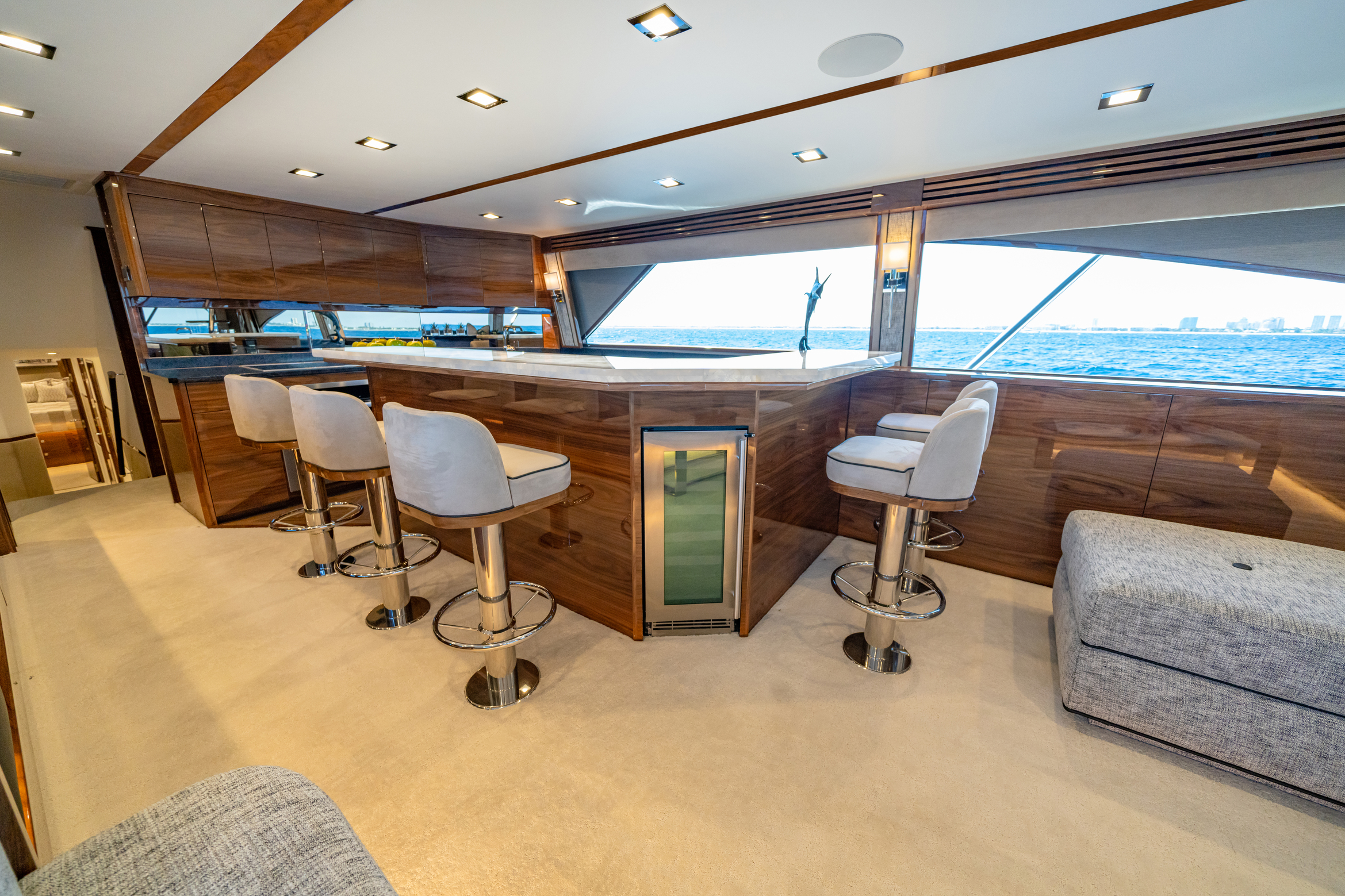 The Viking 90 Sky Bridge features an exciting cockpit and dual mezzanine, creating a harmonious atmosphere focused on the stern. A 40-inch-wide electric-powered single door opens to reveal the grand upper mezzanine with an L-shaped lounge, air-conditioned backrests, and a teak table. The lower mezzanine offers a spacious lounge area with panoramic views, tackle drawers, and engine access. It also includes an oversized freezer and refrigerated boxes to keep your catch fresh.